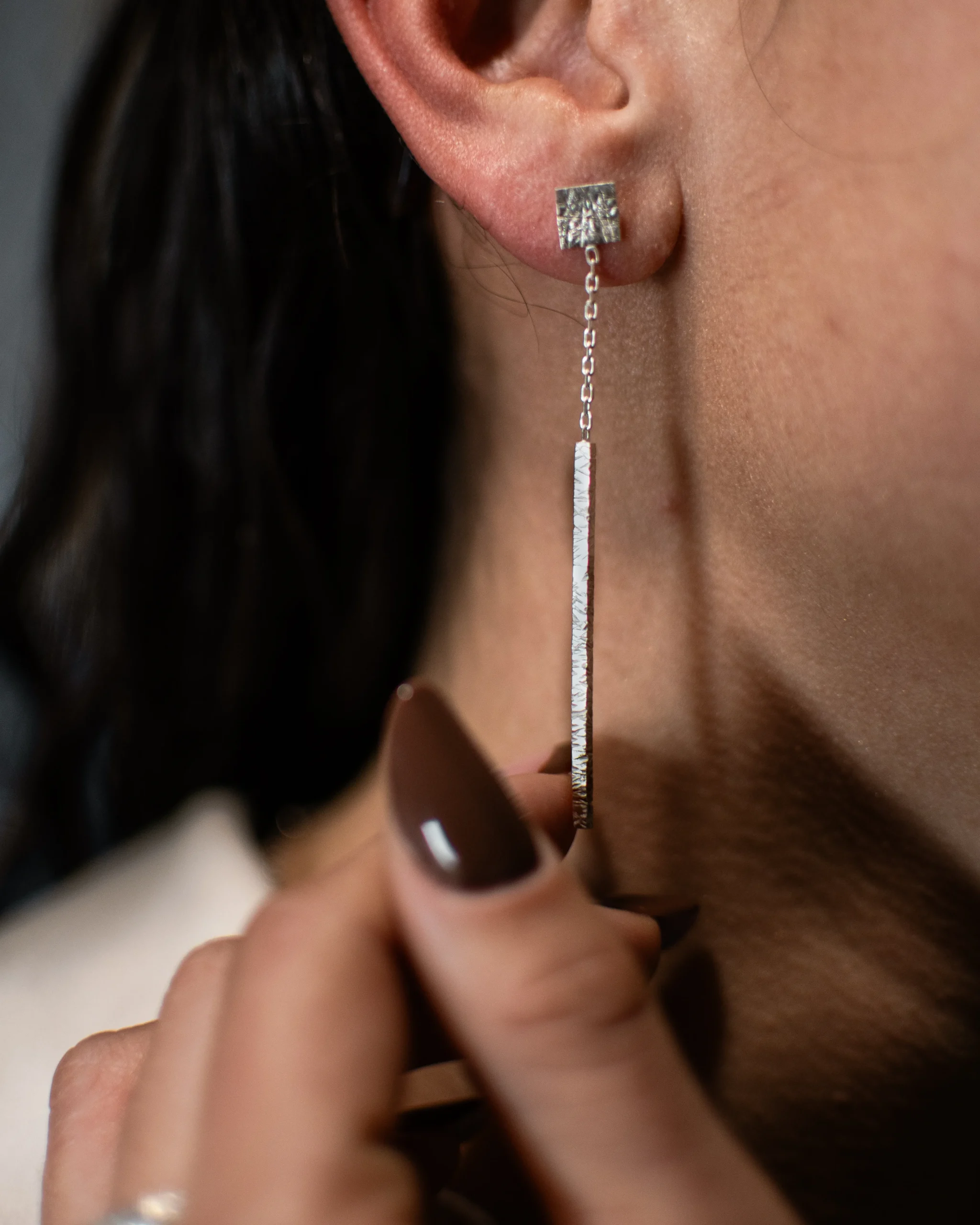 Boucles d’oreilles en argent 925/1000, confectionnées à la main dans notre atelier. L’aspect martelé du métal apporte une texture rugueuse et crée un effet de profondeur, évoquant les falaises côtières.