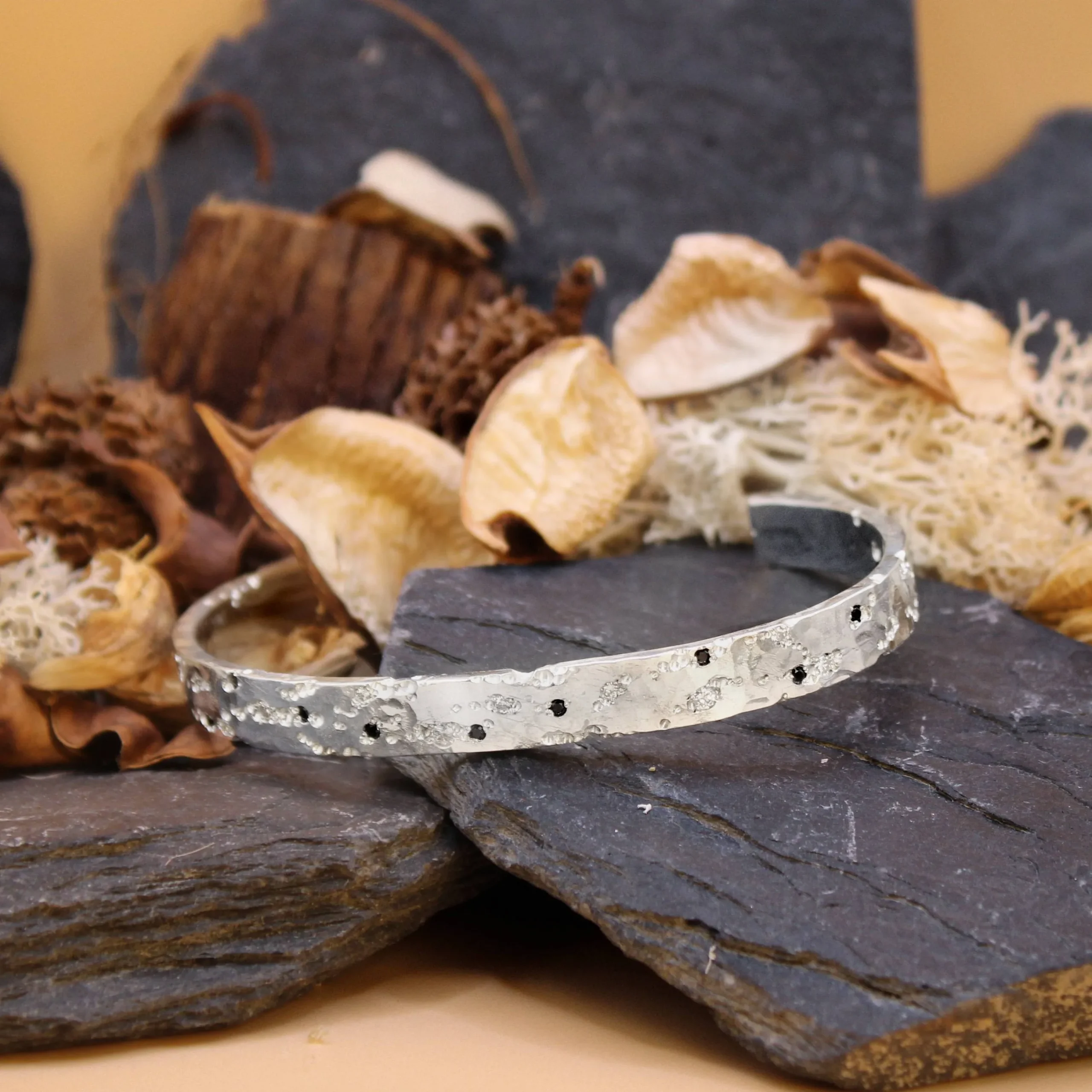 Bracelet en argent 925/1000 sertie de diamants blancs de synthèse et de spinelles noirs. Confectionnée à la main dans notre atelier.